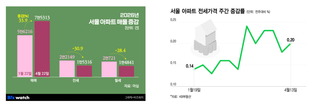 실제로 전세가격 상승률도 3월 초 0.14% → 4월 중순 0.20%로 상승폭도 커졌습니다.