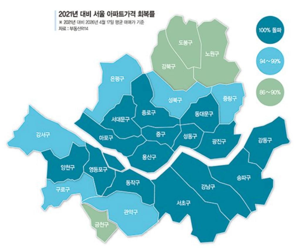 현재 서울 25개 구 중 15개 구는 이미 2021년 가격을 회복했습니다.