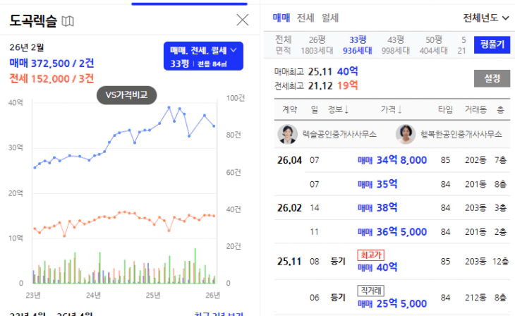 (도곡렉슬은 작년 최고가 대비 5억 정도 하락했습니다)