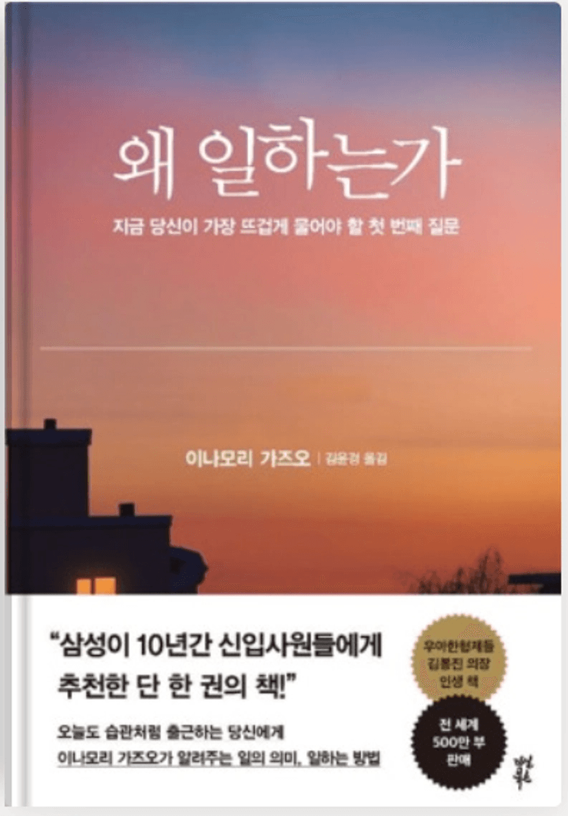 4.이유: 일을 함에 있어 그냥 시간 흘러가는대로 보냈는데 “당신은 어떤 일을 하는가? 왜 그 일을 하는가? 그 일을 하는 당신은 무엇이 되길 바라는가?” 질문을 던지며 일 뿐만 아니라 삶에 대한 태도에 대해 가져야하는 마음가짐을 상기시켜줌