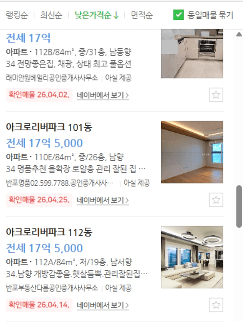 그런데 동일한 매물을 여러 부동산에서 등록하기는 했습니다.