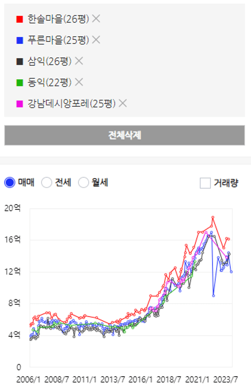 구축이지만 선호도 높은 동네에 속한 한솔마을이나 추른마을보다는 낮은 시세를 보이고 있고,