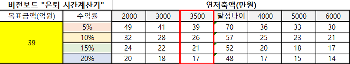 목표 금액 39억 (현재 나이 31세, 연저축액 3500만원, 희망 은퇴시기 50세)