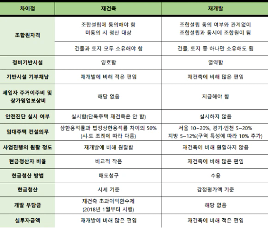 또한 재건축은 안전진단이 무조건 필요하지만, 재개발은 안전진단 과정이 없으므로 안전진단하는 데 드는 비용을 아낄 수 있습니다.