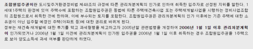 이 단계에서는 아파트를 분양받을 수 있는 조합원의 조건과 아파트 면적 등을 정합니다. 이에 따라 조합원이라고 하더라도 아파트를 분양받을 수 있는 조건이 되지 않는다면 아파트 대신 현금을 받게 되고, 다행히 현금 대신 아파트를 받는다고 하더라도 원하는 면적을 분양받지 못할 수도 있습니다. 그뿐만 아니라 두 사람이 공동으로 주택이나 토지를 가지고 있을 때는 아파트를 한 채만 분양받을 수 있다든지 하는 등의 사항이 일차적으로 결정됩니다.