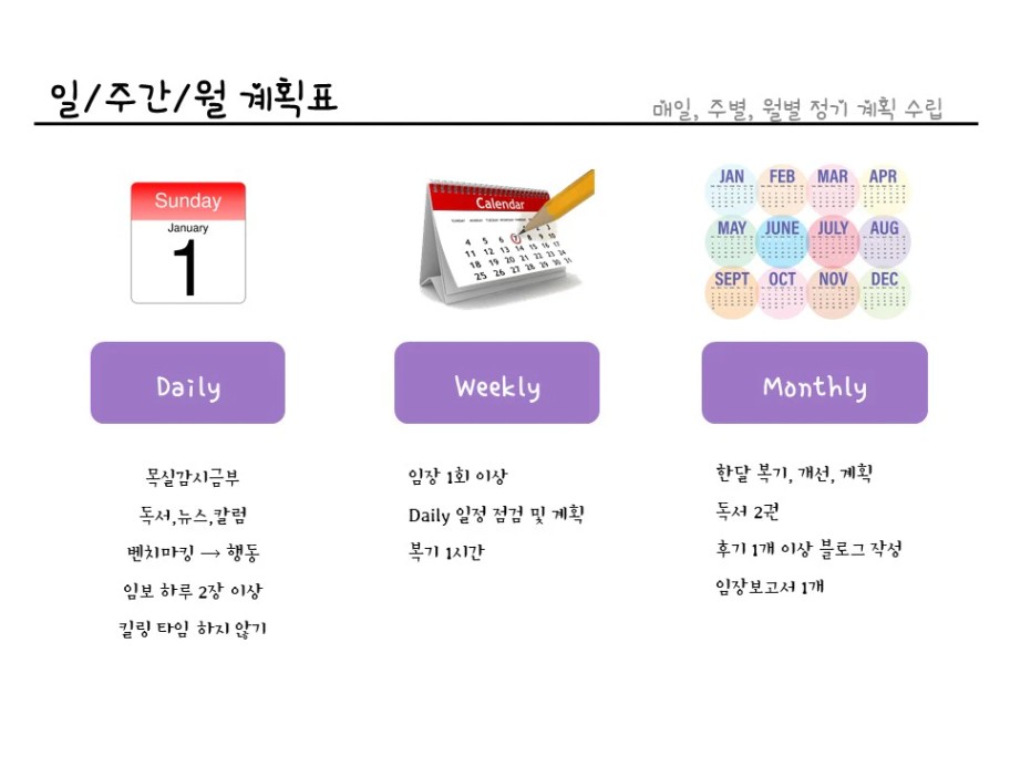 목표를 가는데 있어서 그 징검다리가 되어주는 중간목표 (월,주,일)이