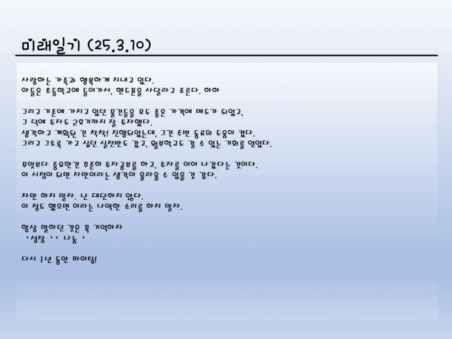 위캔미님~~비전보드 너무 이쁘네요 ㅎㅎㅎ역시!!!매도가 잘될 25년 3월을 응원드리며, 투자도 착착착 잘되기를 완전 응원드립니다. 꾸준한 투자공부가 정말 힘든데 위캔미님이라면 충분!!항상 나눔 감사합니다!!!3월 파이팅!!