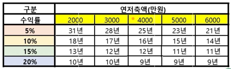 연수익률15%를 달성하면 12년, 현재나이 45세이므로 은퇴가능 나이는 57세.