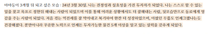 - 24년 성장 포인트였던 '글쓰기'를 재미있게 시작하고 있다. 이전학교 무명인 반장님의 조언대로 일단은 양으로 쓰는걸 해내고 나니 재미를 붙이고 있고 스스로 하고 싶은, 잘하는 일을 찾아나가고 있는 과정에 있다. 이번 학교를 하면서 한번도 놓지 않았던게 책읽기와 글쓰기였다. (투자가 목적인 월부학교에서 이런 행동을 한건 잘못됬지만 힘든 마음을 달랠 나만의 길이였다. 나만의 감정 표현,정리)