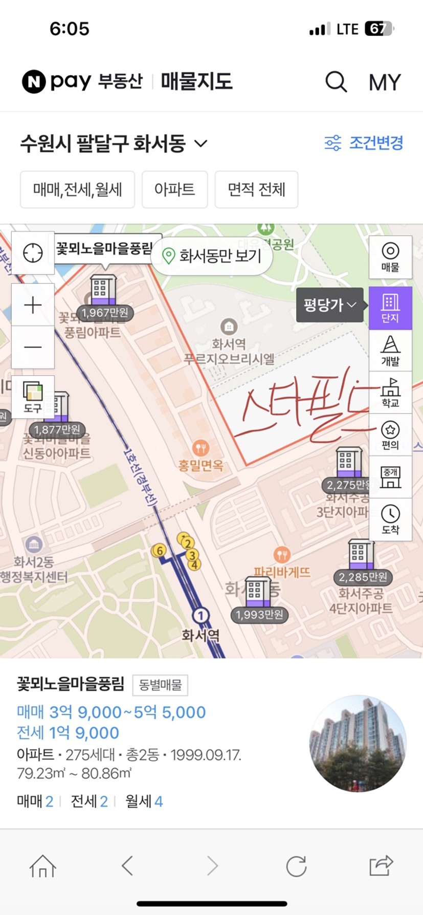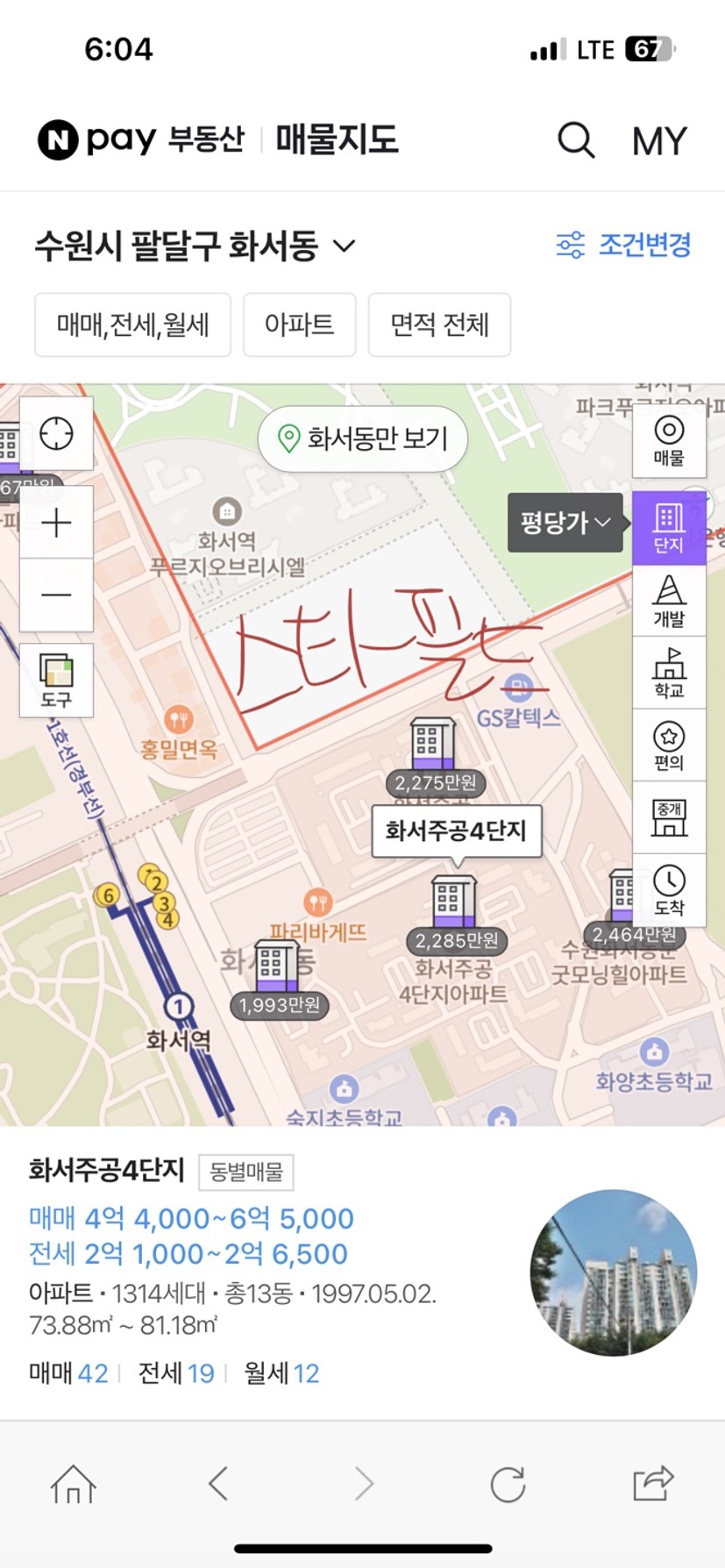 첫 번째로 보고 있는 매물은 스타필드와 화서역을 품고 있는 주공 4단지(전용59)인데, 5억 초중반에 거래가 되고 있구요.