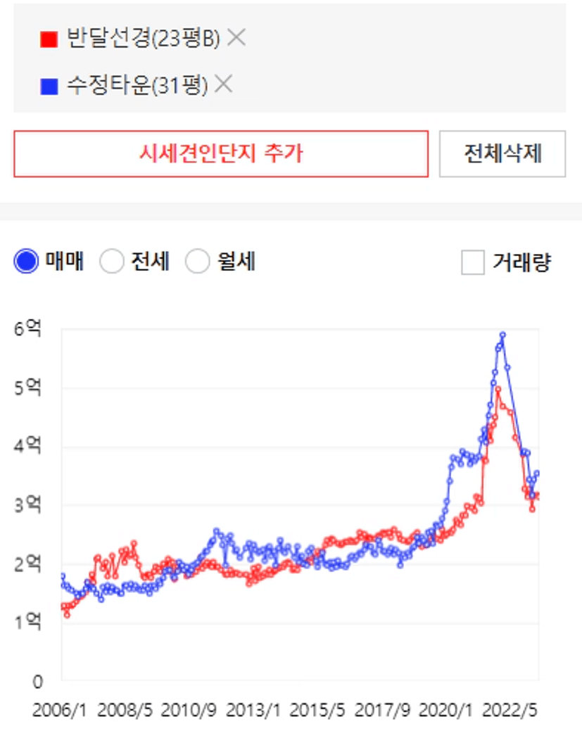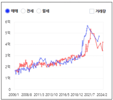 매매가격은 오히려 떨어지거나 보합하고 있습니다.