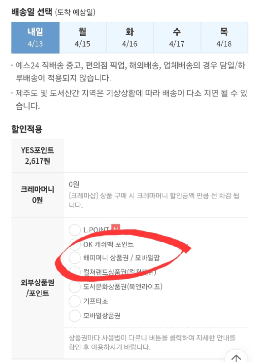 6. 온라인 책 구매 사이트에서 결제 진행시 해피머니 상품권!