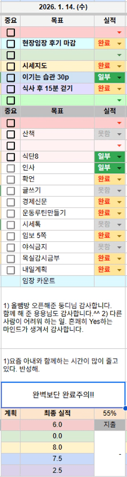 [지투실 27기 8조 익힘의 정도가 으뜸이라, 생존할 조 홍드림] 1/14실적 및 1/15목표, 감사일기