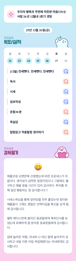 [내마실 엔젤빈쓰 튜터님과 함께하니 4주? 아니조~ 3주만에 내집마련 성공했조 채니] 25.12.25~26 목실감