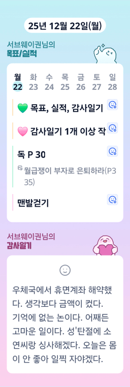 [열기89기 투자원칙대로 chilly(72)하게 안정적으로 투자하조_만보] 25.12.22 목실감