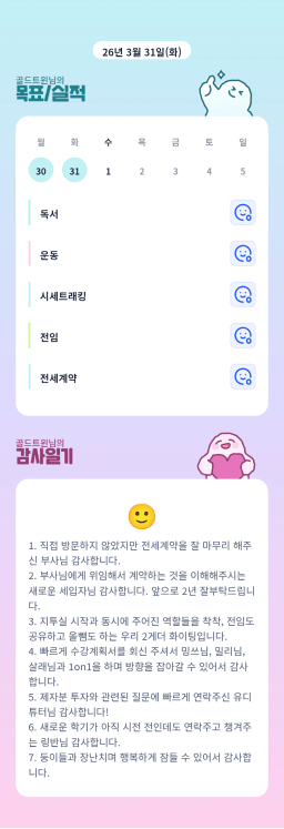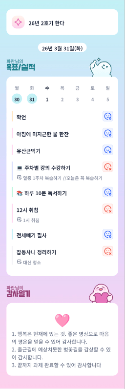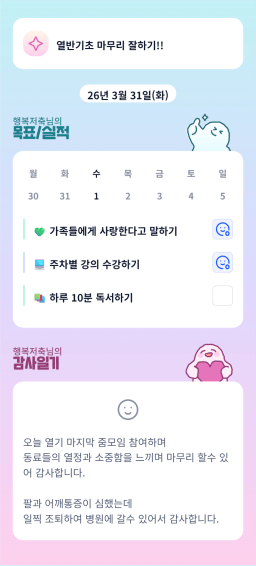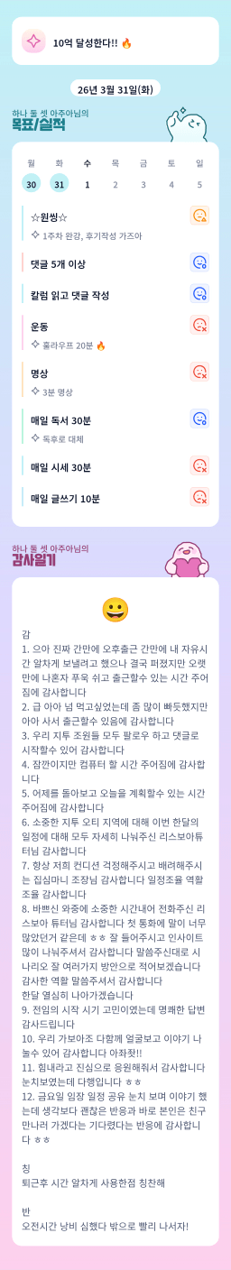 [하나 둘 셋 아주아] 목실감 누적 230일, 연속 7일 진행중 26.03.31 화요일