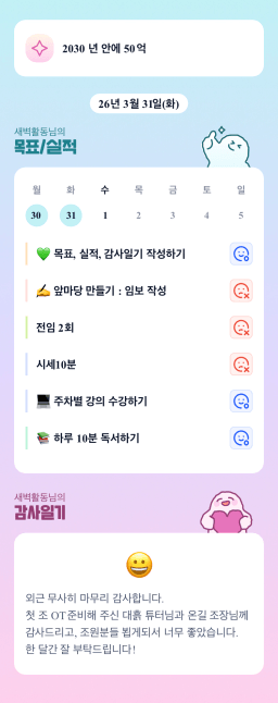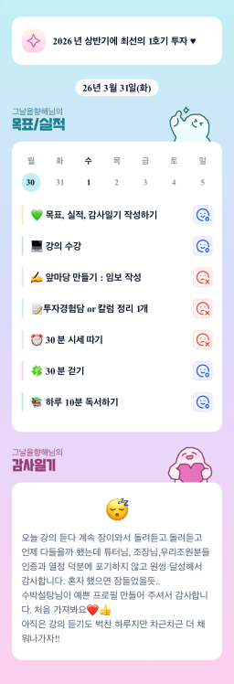 [내마실 프메퍼튜터님과 5래 보유할 6각형 내집마련 조 & 지투28기 멤튜님이 내멤속에 원(1)픽이조 파랑파랑] 26.03.31 목실감시금부