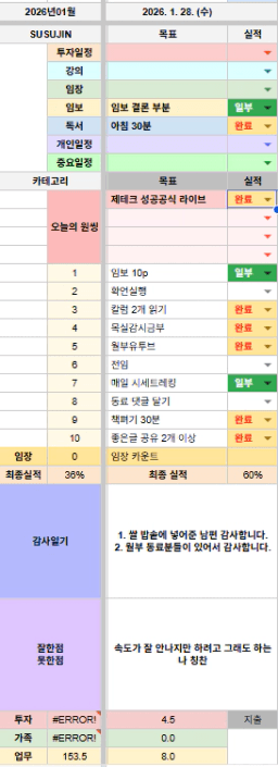 1/28 목표,실적,감사일기,시간가계부[헤라클래스]
