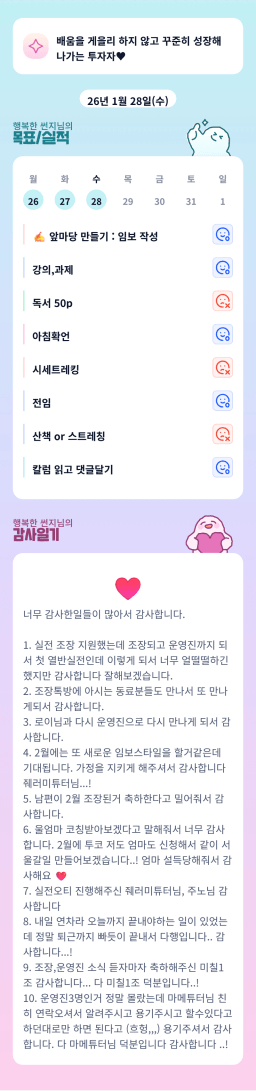 [우지공튜터님과 지투27기 왔다네 정말로 아무도 안 믿었던 투자해! 종말로!! 2t's5ver tonight 단단원이] 1/27-28 매일 감사하단