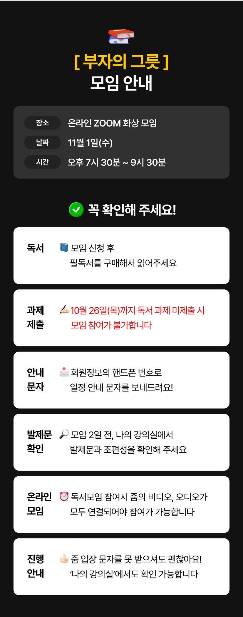 그래서 그냥 순간적으로 흥미를 돋울 수 있는 코인으로 벼락 부자되어 퇴직한 누구누구 이야기, 혜택 좋은 카드, 무슨 주식이 요즘 괜찮더라 하는 일회성 정보에 대해 이야기 하게 되는데 돈버는 독서 모임 안에서는 잃지 않는 투자를 하기 위해 우리가 봐야할 것, 필요한 것, 갖춰야 할 자세에 대해 이야기 할 수 있고 시스템 투자자로 성장하기 위해 다같이 고민해보며 거기에 덧붙여 튜터님의 정리와 가이드까지 받아볼 수 있어서 진심으로 투자자만을 위한 독서모임이라는 것이 느껴져서 너무 유익했습니다.