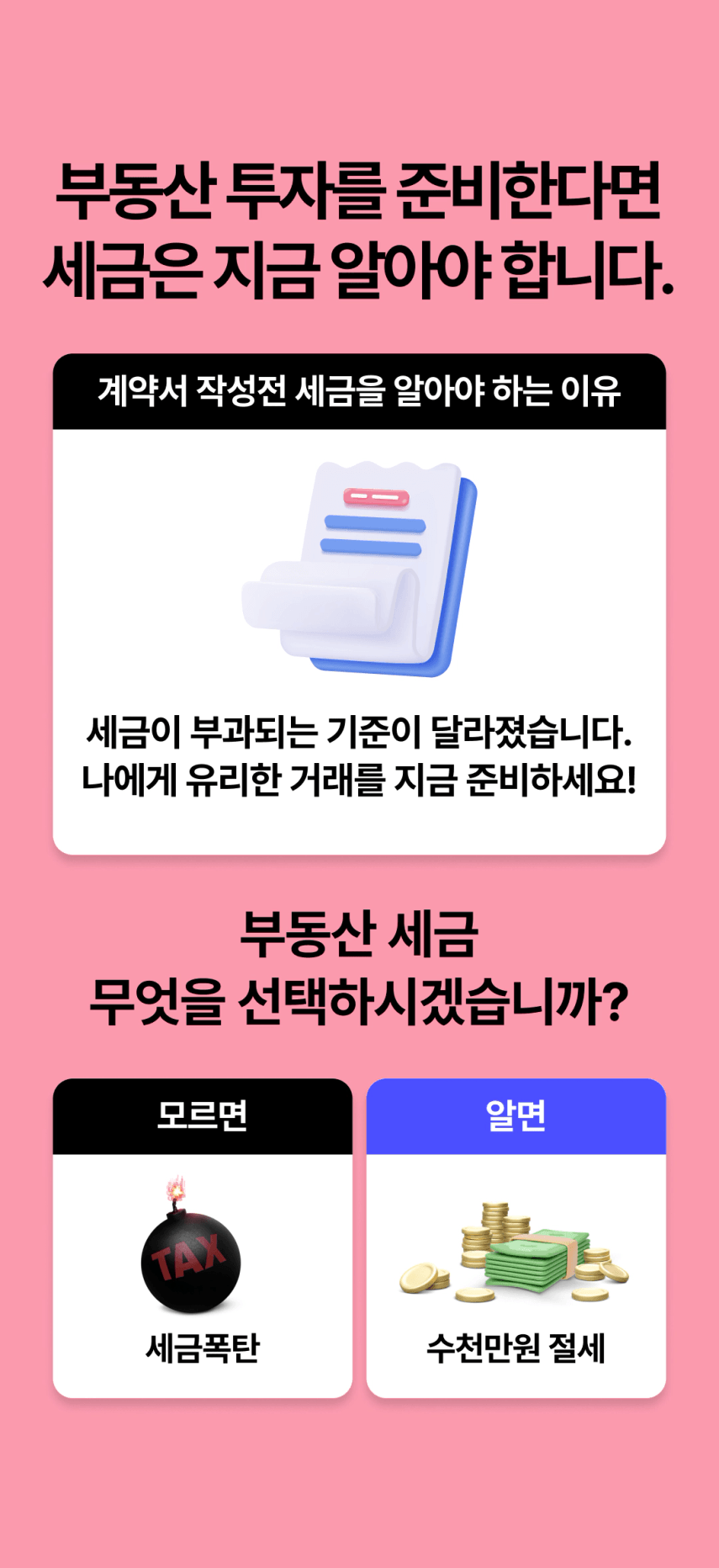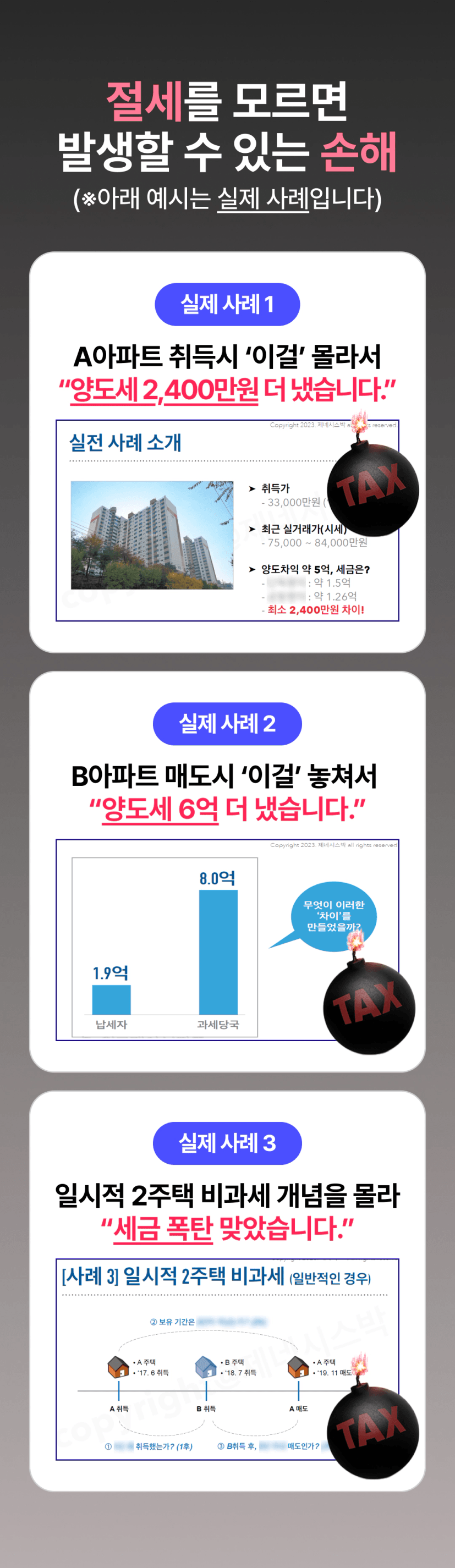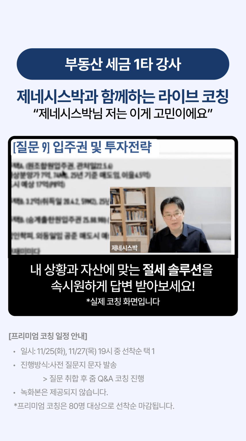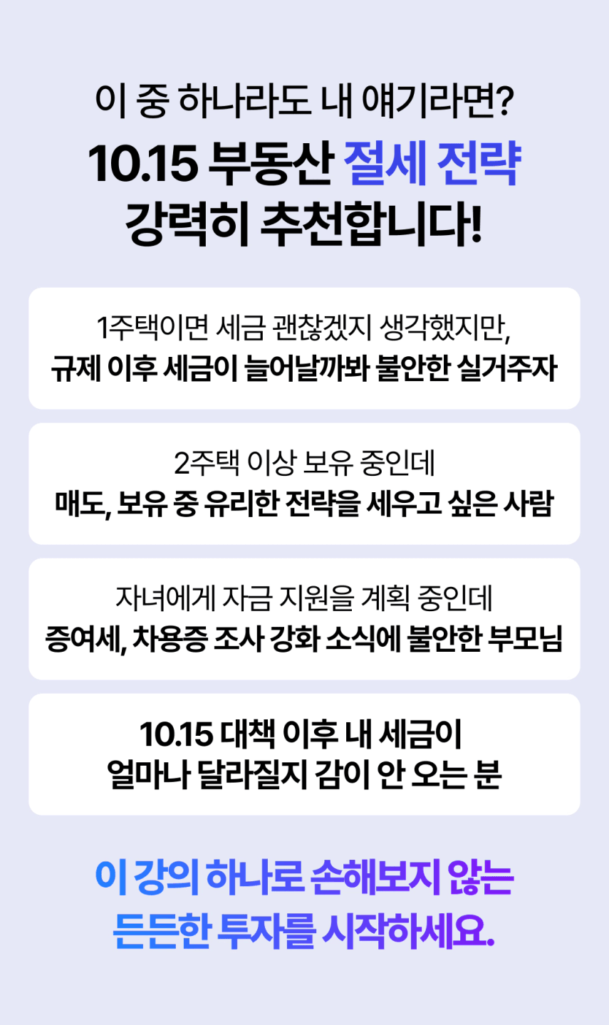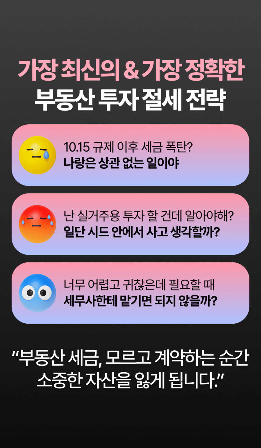 무주택자, 1주택자, 2주택자 등등 모두 상황이 다르실 겁니다. 그런데 세금은 빨리 알면 알수록 돈을 법니다. 제가 날린 3천만원, 세금 강의를 한 번만 들었다면 날리지 않았을 돈이에요. 여러분도 큰일이 나기 전에 미리 알고 자산을 잘 키워나가셨으면 좋겠습니다. '내가 이런 절세도 할 수 있었어?'라고 놀라실 거에요.