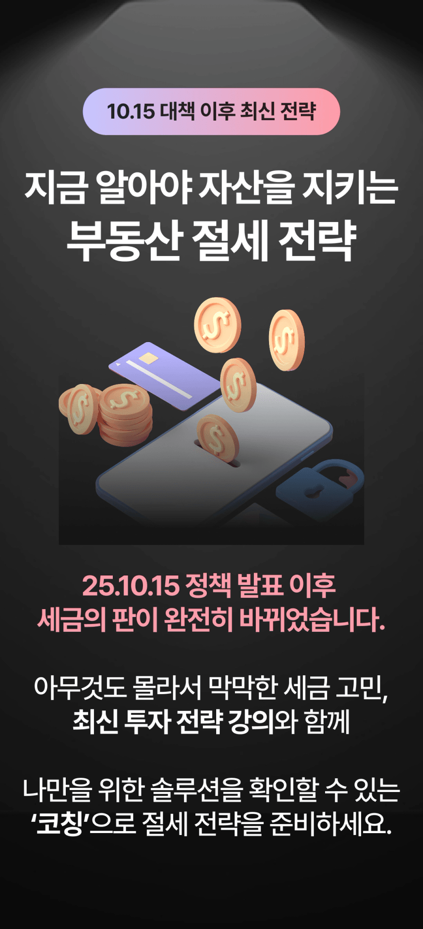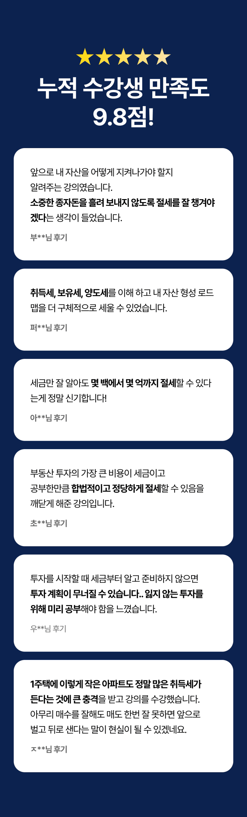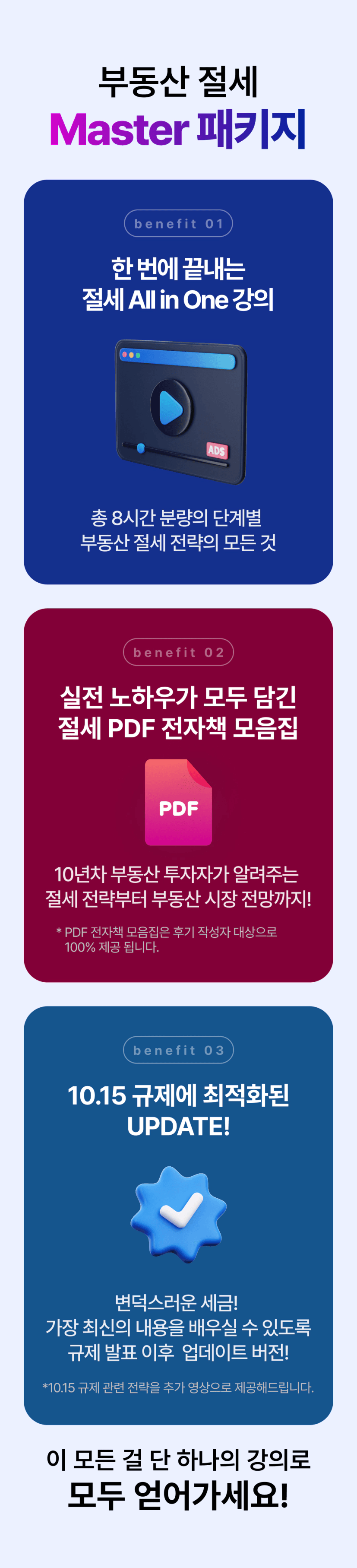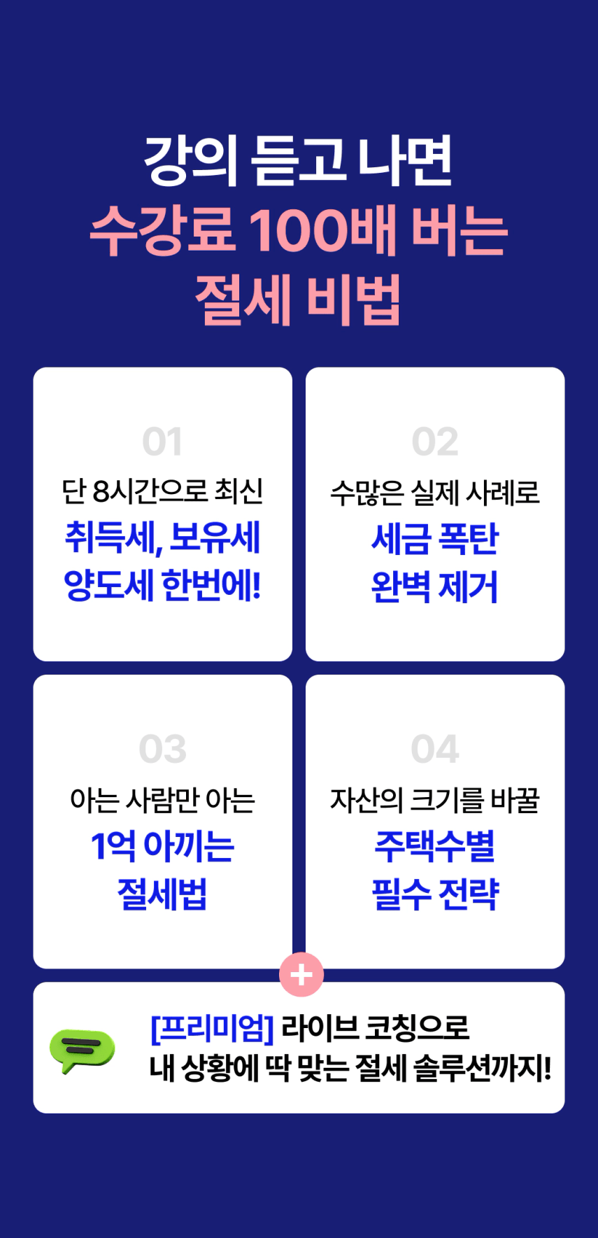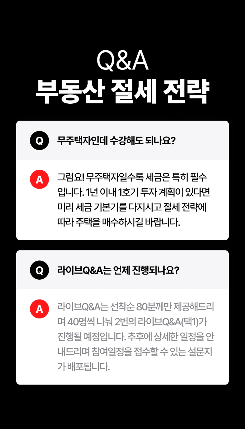 '세금... 나중에 공부해야지' 생각만 하고 마음 한 켠이 불편하지 않으셨나요? 그 찝찝함 제가 날려드리겠습니다. 불필요한 내용은 빼고, 딱 실생활에 꼭 필요한 부분만 정리했습니다. 이제 여러분은 '부동산 세금' 이야기만 들어도 자신있게 웃으실 수 있을 거에요. 그럼 강의에서 뵙겠습니다.