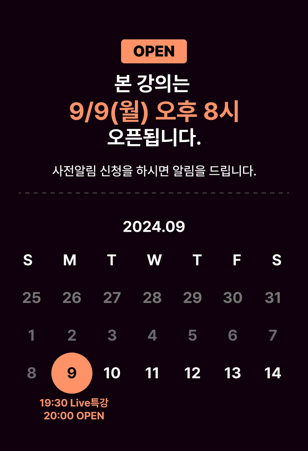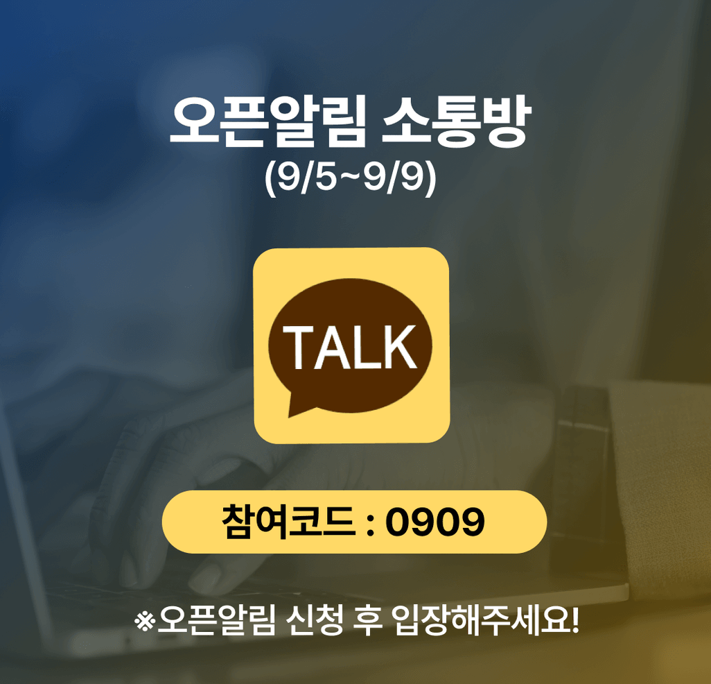 v 오픈 알림 신청자 대상으로 9/5~9/9 사전 단톡방이 운영됩니다.