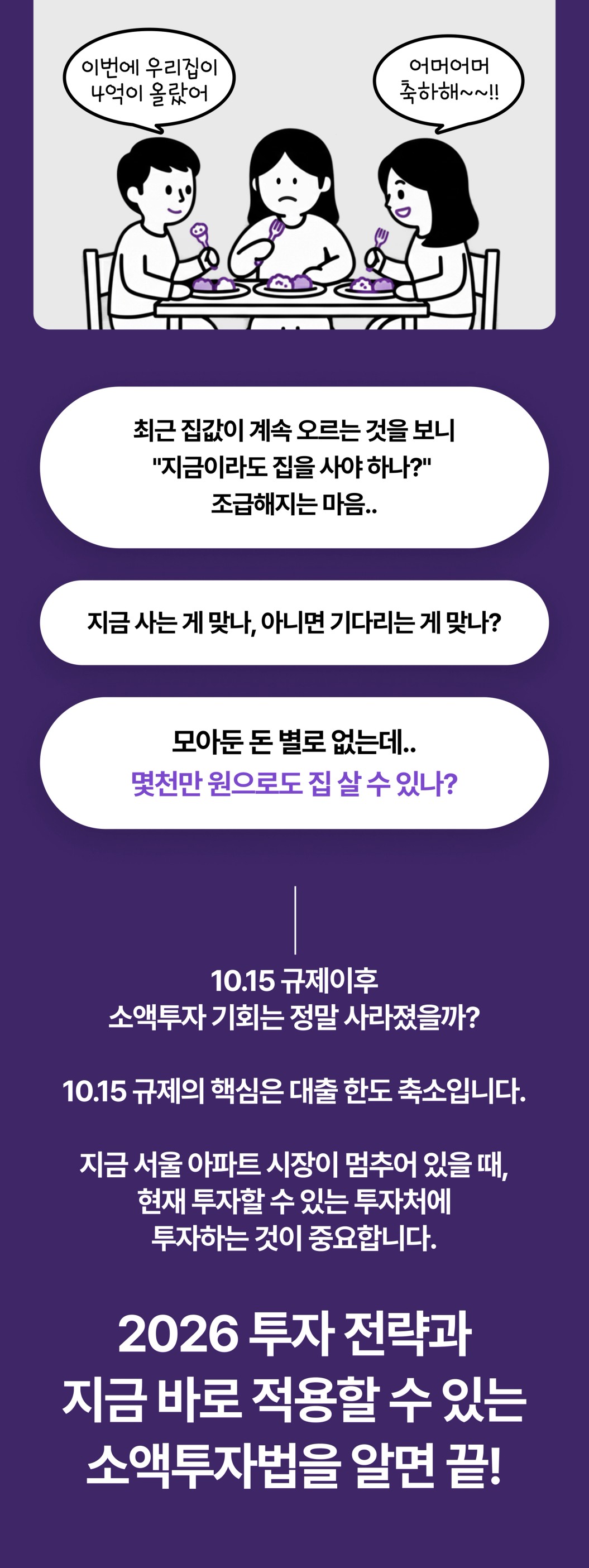 “내집마련 해야될까요? 투자해야 될까요?” “똘똘한 한채가 좋을까요? 분산 투자가 좋을까요?” “가격이 싸고, 투자금이 적으면 다 투자해도 되나요?” “아파트 외 다른 부동산 투자는 어떤가요?” “제가 과연.. 부동산 투자를 할 수 있을까요?”