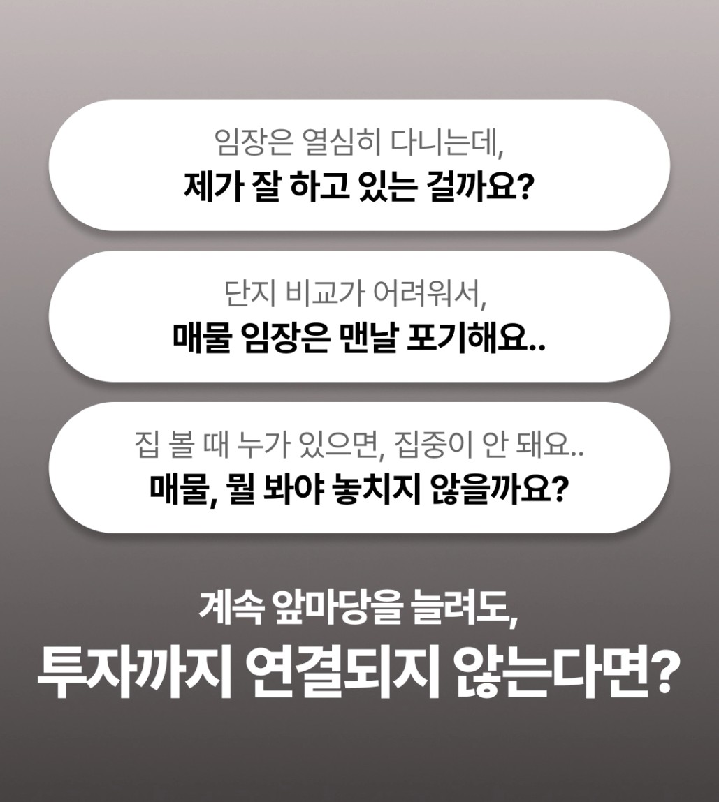 중개사분과의 질의응답시간이라는 이런 귀한 시간이 너무 궁금해서 강의 신청한 것도 있었습니다. 긴 시간동안 질의응답을 하며, 중개사분의 입장에서 매물보는 저의 모습을 되돌아보니, 그동안의 실수를 알게되었고 앞으로 어떻게 해야하는지 방향성도 잡게 되었습니다. 정말 이런기회가 또 있을까 싶네요~!