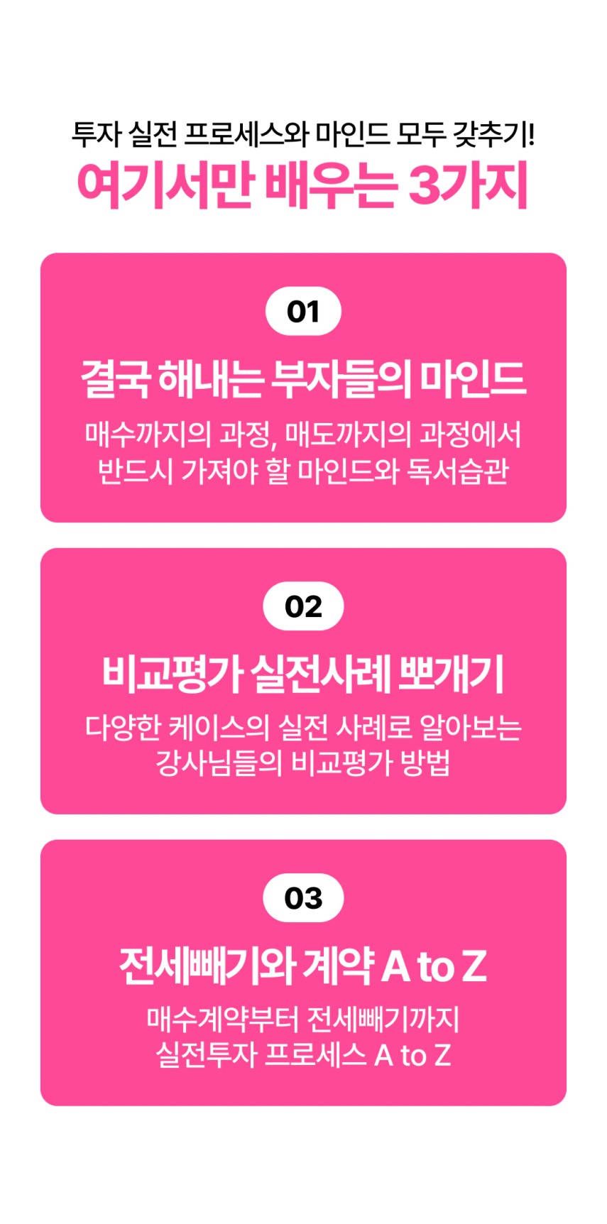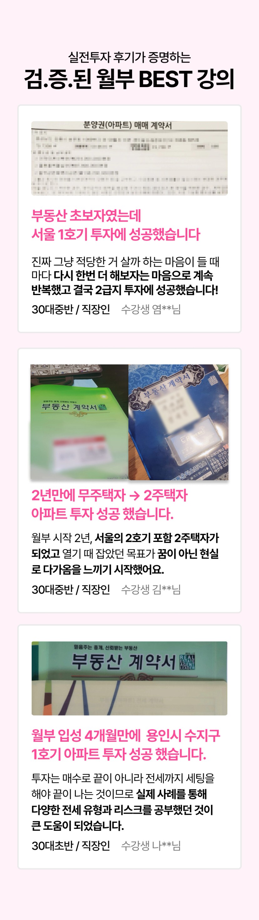 이때까지 열기, 실준, 서투기, 지투기 강의를 들으면서 전세 셋팅에 대한 내용도 배우긴 했지만 이렇게 디테일하게 배운 적은 없었는데 전세에 대해서 모든 경우의 수를 알수있게 돼서 너무 좋았던 강의였습니다. 강의 내용을 여러번 복기하면서 앞으로의 투자를 할 때 매수부터 전세 놓는 것까지 잘 마무리 할 수 있도록 하겠습니다. 매번 알차고 좋은 강의 해주셔서 감사합니다: )투자를 할 때 리스크에 대해서 항상 두려움이 있었고 1주차 강의에서도 리스크를 볼 때 공급만 보는 것이 아니라 전세가 안나간다면 잔금 대비까지 할수있어야 한다고 배웠는데 그 내용을 배웠을 때 나는 잔금대비가 안될 것 같은데.. 라는 생각이 들었습니다. 그래서 그럼 투자를 하기 어려운건가? 라는 고민이 있었는데 2주차 강의에서 잔금대비가 어려운 경우에는 주인전세나 세안고 매물을 매수해서 대응을 할수있다는 것을 배우게 돼서 고민하고 있었던 부분이 해소가 되어 좋았습니다. 그리고 앞으로 임장보고서를 쓰고 1등 뽑기를 할 때 네이버 호가 기준으로만 전세금를 확인 하는 것이 아니라 강의에서 배운 내용대로 ‘단지, 생활권, 공급’ 을 기준으로 실제로 전세를 놓는다면 전세셋팅을 얼마에 놓을 수 있을지 확인해서 1등뽑기를 마무리해봐야겠다는 생각이 들었습니다! 그리고 이렇게 사전 조사를 하고 부동산에 간다면 다른사람에게 끌려다니지 않고 주관을 가지고 투자를 할 수 있겠다는 생각이 들어 좋았고 도움이 많이 되었습니다