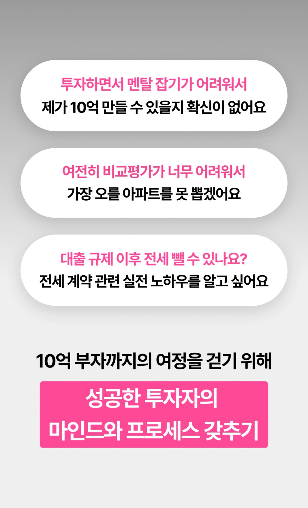 5년 내 자산 10억을 만들기 위해 꼭 들어야할 강의였다.전세대출이 막히고, 매매가가 상승하는 시장에서 내가 잘 할 수 있을까 하는 걱정을 날린 한 주였다.이번주 강의를 통해 현재 투자시장이 어떤지, 내가 어떤 지역을 선택하여 봐야할 지 명확하게 알게 되었다. 지방과 수도권 각 지역의 시세흐름을 알고 내 상황에 맞는 지역이 무엇인지,어지럽던 생각이 좀 더 정리된 것 같다.3년내에 내가 할 수 있는 한, 가장 가치있는 자산을 선택해서 2주택를 만들어서 투자를 멈추지 말아야겠다. 가치가 상승한 자산을 매도하여 좀 더 가치있는 자산을 매수하는 팁도 알려주셔서멈추지 않는 투자공부 동기부여를 알려주셔서 좀 더 장기간으로 봐야겠다.가장 좋았던 것은, 내 투자금에 아직 서울, 수도권 시장이 가능하다는 것을 알게 되어 희망이 생겼다.이제 내가 무엇을 해야할지 뚜렷해졌다!서울 25개구와 수도권 지역을 발품발아 내것으로 만들어내년까지 어떻게든 1호기 만들어야 겠다고 재다짐했다. 그것을 위해 주당 20시간 공부 시간을 만들고,매월 수도권 임장보고서를 작성해야겠다.특히 5순위 시세표를 만들어 지속적으로 업데이트하고, 내가 투자할 물건을 계속 비교평가 해나가야겠다.흔들릴때도 있겠지만, 주우이님께서 말씀하신대로 나에게 맞는 투자처 찾는 법을 적용해가며내 투자금을 가능한 지역을 찾아 갈 것이다.월부 환경 안에서, 오랫동안 잃지않고 투자해나갈 수 있는 힘을 얻은 강의 였다.주우이님처럼 행복한 투자자가 되기 위해 왜 투자를 하는지, 무엇에서 행복감을 느끼는지균형을 잘 잡아가며 앞으로 정진해야겠다.