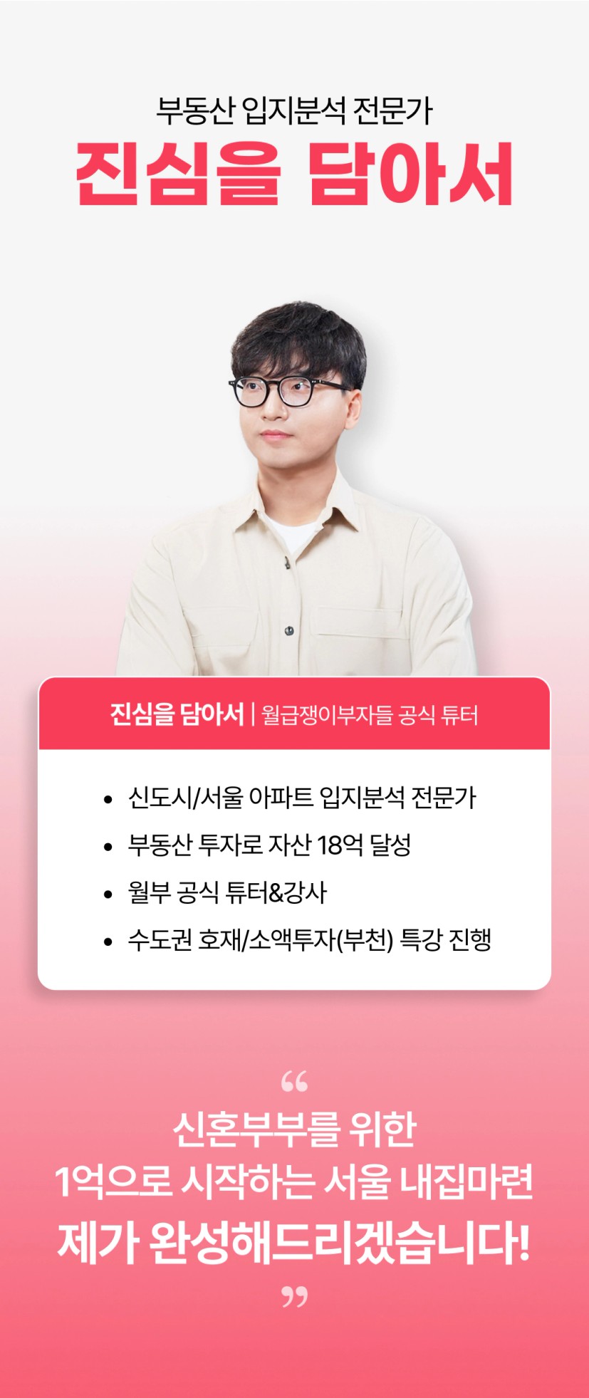 첫 부동산 매입 당시 크게 돈을 잃어서 다시는 과거와 같은 실수를 반복하고 싶지 않다는 마음으로 1천만원을 들고 첫 공부를 시작했습니다. 아무나 할 수는 없지만, 누구나 할 수 있는 ‘부동산 투자로 돈을 버는 방법’에 대해서 조금씩 배워가며 자산을 쌓고 있습니다.