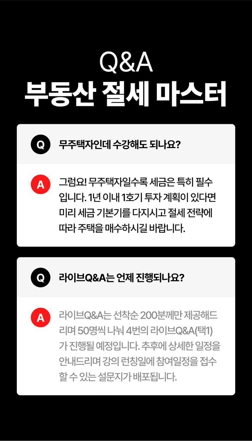 무주택자, 1주택자, 2주택자 등등 모두 상황이 다르실 겁니다. 그런데 세금은 빨리 알면 알수록 돈을 법니다. 제가 날린 3천만원, 세금 강의를 한 번만 들었다면 날리지 않았을 돈이에요. 여러분도 큰일이 나기 전에 미리 알고 자산을 잘 키워나가셨으면 좋겠습니다. '내가 이런 절세도 할 수 있었어?'라고 놀라실 거에요.