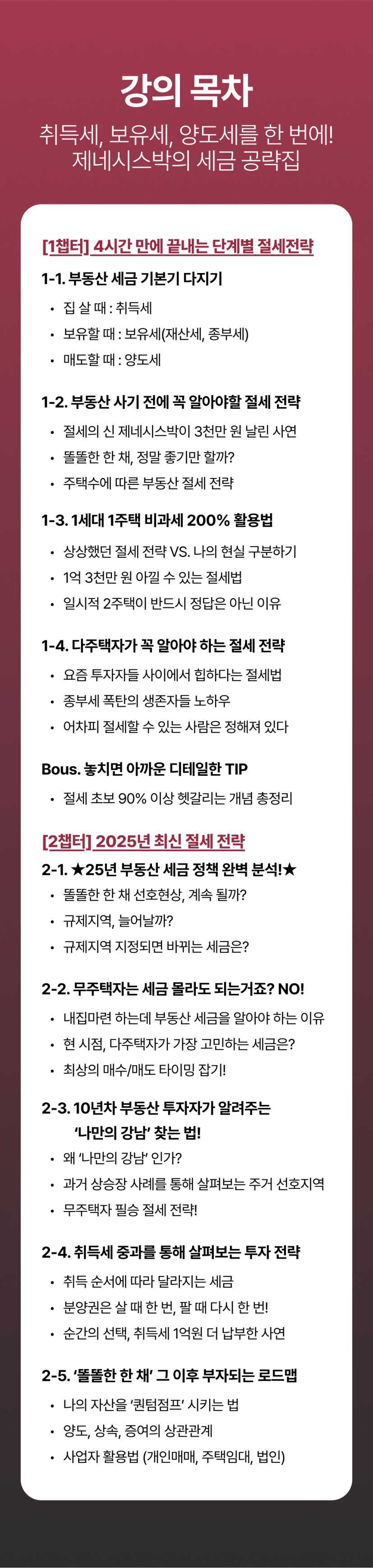 '세금... 나중에 공부해야지' 생각만 하고 마음 한 켠이 불편하지 않으셨나요? 그 찝찝함 제가 날려드리겠습니다. 불필요한 내용은 빼고, 딱 실생활에 꼭 필요한 부분만 정리했습니다. 이제 여러분은 '부동산 세금' 이야기만 들어도 자신있게 웃으실 수 있을 거에요. 그럼 강의에서 뵙겠습니다.