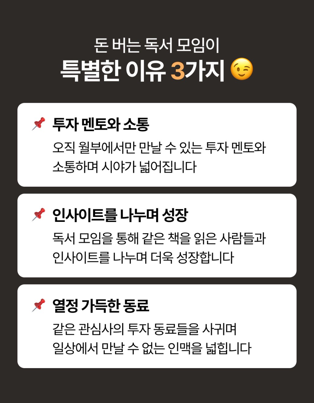 돈버는 독서모임? 처음엔 이게 무슨말이지 했는데 해보고 나니 해당 도서로 이어지는 투자의 기준, 투자자가 갖춰야 할 마인드를 다 같이 다시 생각해보고 각자 그 동안의 경험들을 나눌 수 있는 앞으로 돈을 벌어다 줄 저를 만들어나갈 수 있는 좋은 시간이었습니다.