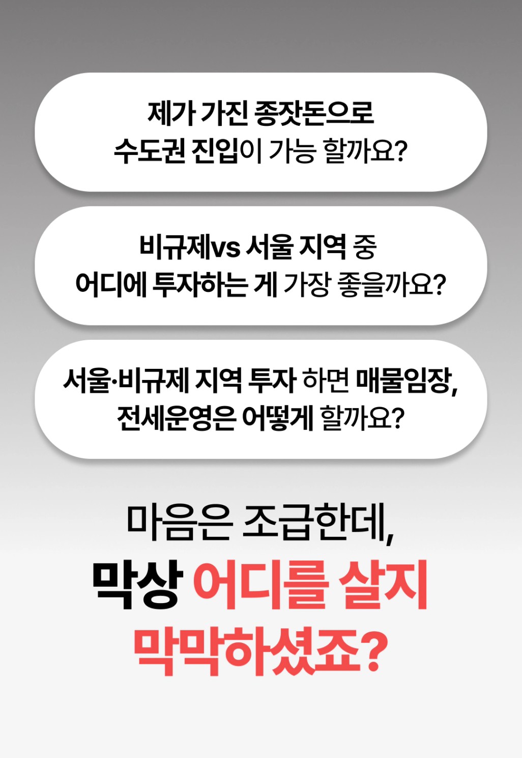 - 토허제 투자시의 고민점 해결 - 투자 우선순위 결정하는 확실한 기준 - 평형/구조/연식 등 투자 결정할 때 어려운 사항 완벽 정리 - 서울투자 기초반 끝나고 해야 할 것