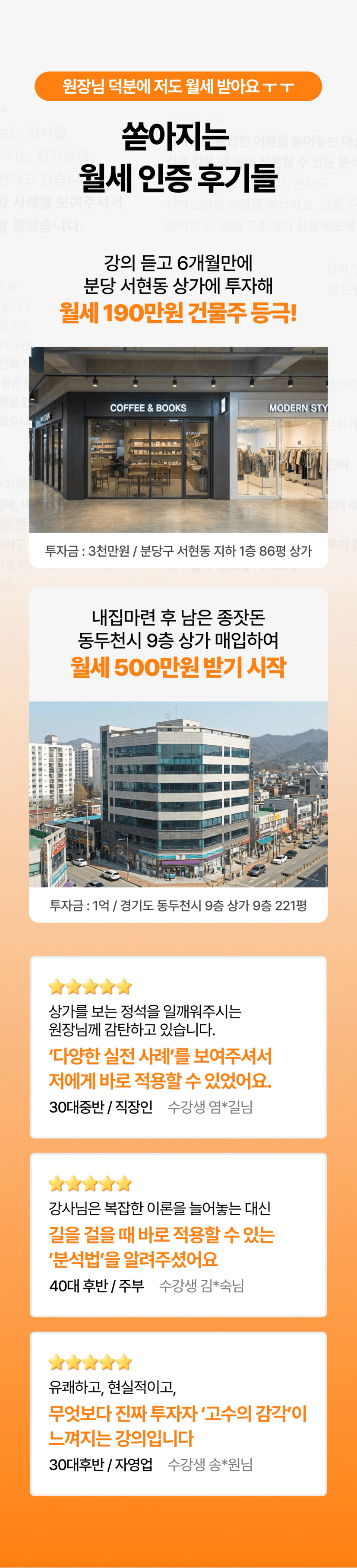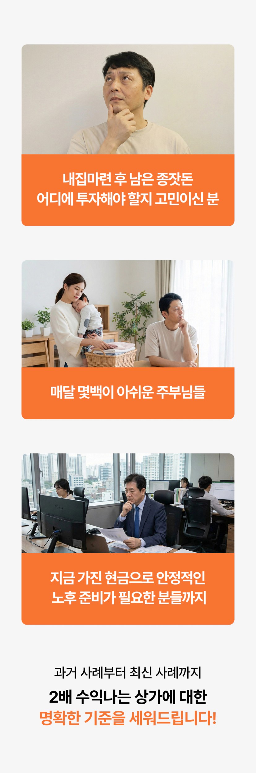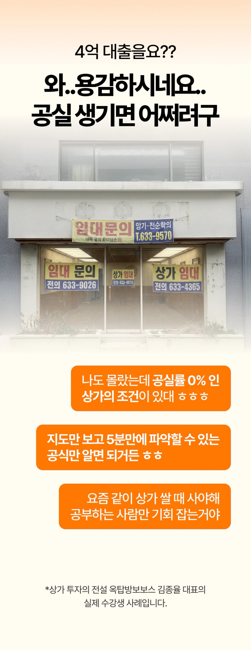 - 아름답게 포장된 상권, 간판만 믿고 투자하지 않고 입지 데이터/현장 리스크/임대 수요 등 수치화/계량화하여 상가 수익 구조를 분석하는 전문가