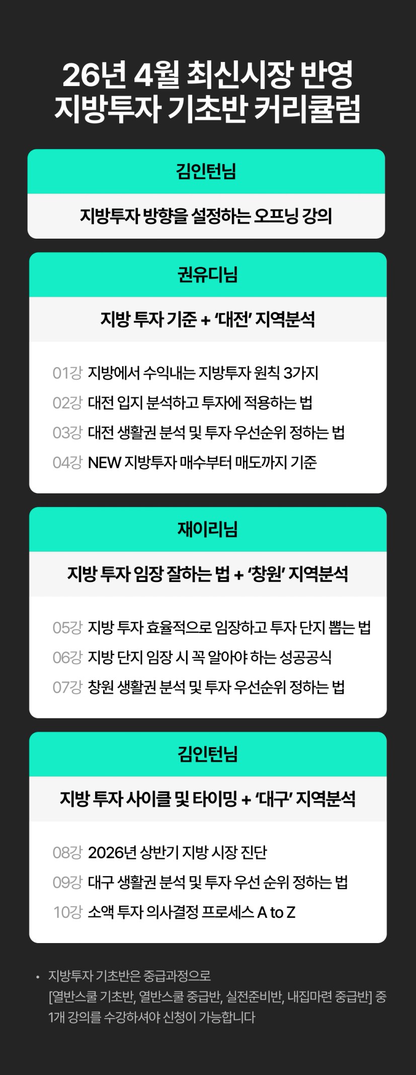 | 수강 조건 | 기초, 중급 수도권, 중급 지방, 중급 마스터, 실전, 이사 |