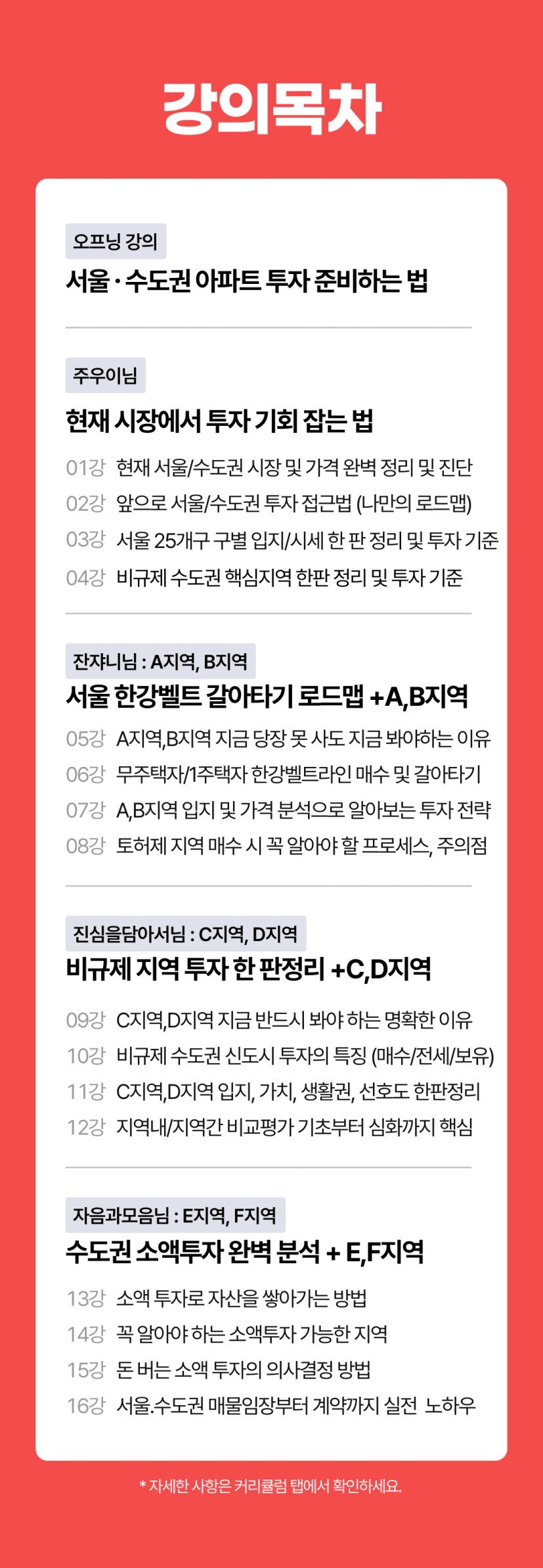 | 수강 조건 | 기초, 중급 수도권, 중급 지방, 중급 마스터, 실전, 이사 |