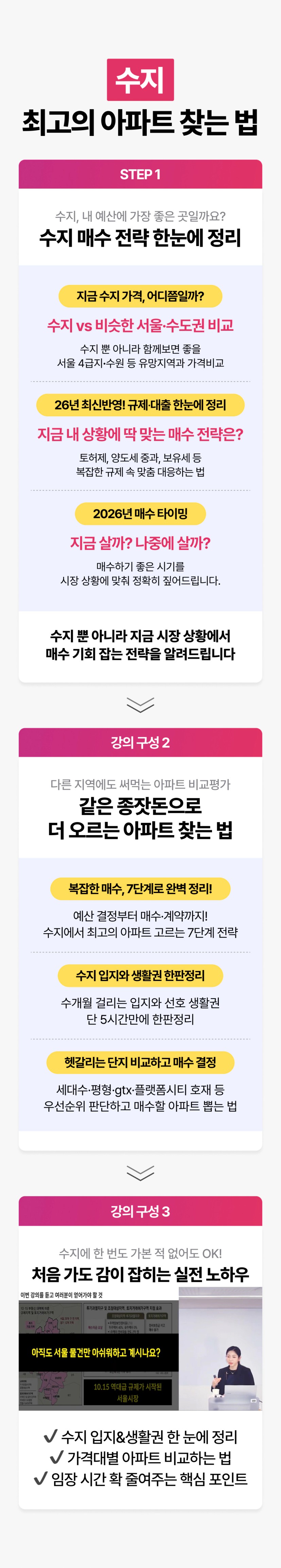 이번 수지 강의도 무려 1년 4개월 만에 열리게 되었어요. 그래서 오히려 지금 들으시는 게 유리할 수 있습니다. 수지는 내집마련 관점에서도 충분히 매력적인 지역이지만, 앞으로 규제 변화가 생겼을 때 '강남/판교 등 직장 근처 가장 가성비 있는 지역'으로 더 주목받을 곳이거든요!