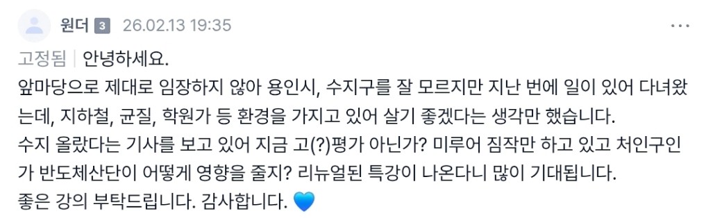 아울러 수지구에 대한 이야기는 아니었지만 플랫폼시티 호재에 대한 언급도 해주셔서 감사했습니다. 수지구와는 어떠한 영향이 있는지, 신분당선과의 비교도 도움이 되었습니다.