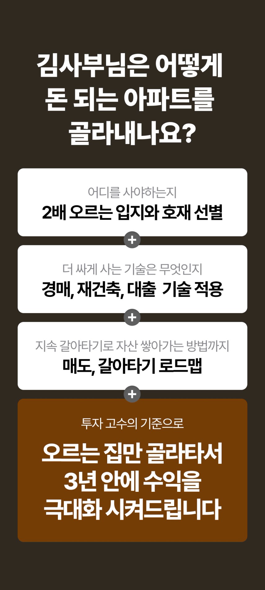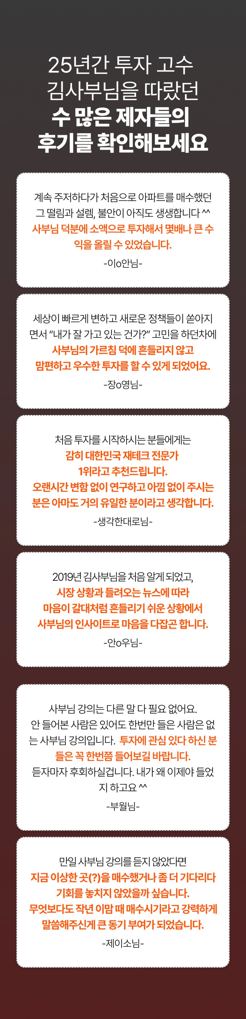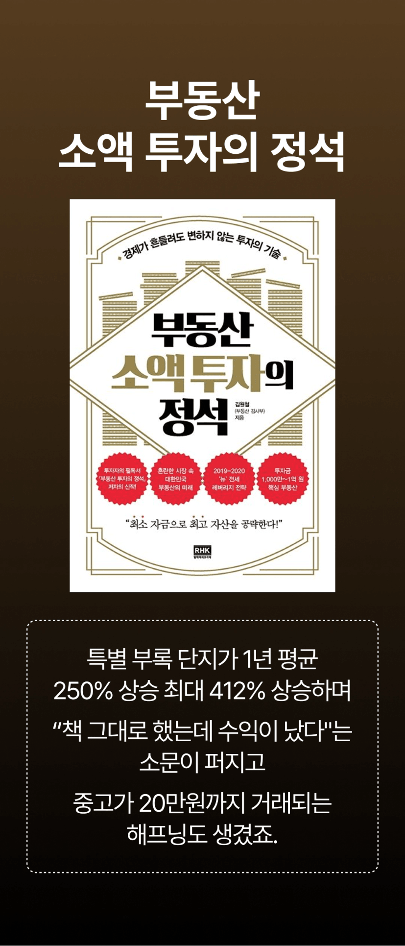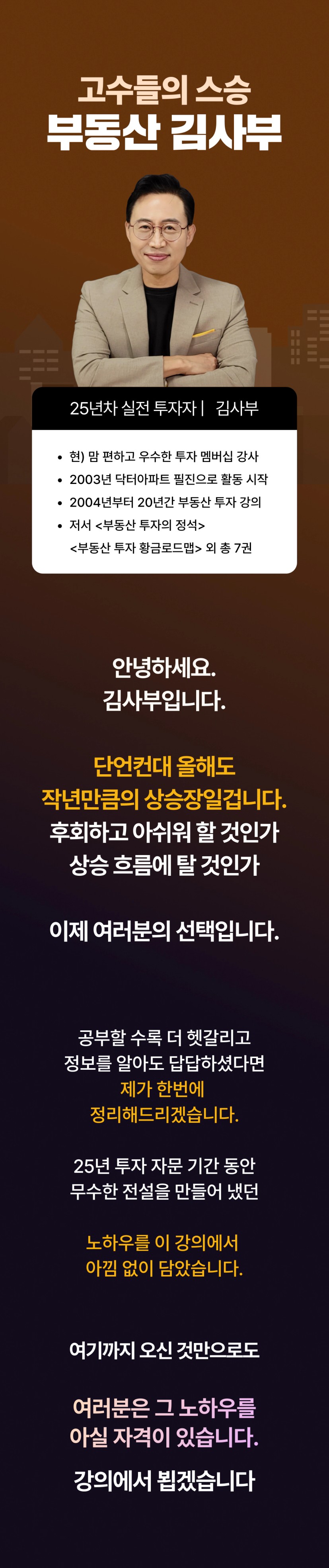 부동산 김사부 수많은 부동산 전문가에게 큰 영향을 준 ‘고수들의 스승’이자 부동산 투자 자문과 교육 회사의 대표다. 약 20년간 두 번의 개정을 거친 스테디셀러 『부동산 투자의 정석』은 부동산 투자자들 사이에서 필독서로 꼽힐 뿐 아니라, 절판 당시 책에 실린 지역과 단지가 몇 년 후 폭등하며 높은 수익을 냈다는 사실이 알려지면서 20만 원의 중고가로 거래되기도 했다. 2009년 강남의 주도권이 도곡동에서 반포로 이동한다는 점과 2014~2015년 고덕래미안힐스테이트를 비롯한 서울의 미분양이 큰 수익이 된다는 점, 2016년 분당의 폭등 등을 예측하여 대중이 모르는 투자 가치를 미리 발견했으며, 2017년에는 둔촌주공에 1억 원으로 투자하는 방법을 공개해 화제가 되었다. 또한 용인과 대전, 창원 등의 지역에서 2000만~3000만 원의 소액으로 투자하는 방법을 알려주어 많은 투자자의 희망이 되기도 했다. 저서 『부동산 소액 투자의 정석』 특별 부록에서 언급했던 단지들은 1년 만에 평균 250%, 최대 412%의 상승률을 달성하면서 책을 따라만 해도 큰 수익을 낸다는 사실이 입증되었다. 평범한 사람도 쉽게 승률 높은 투자를 할 수 있도록 ‘맘 편하고 우수한 투자’ 모임을 통해 20년 이상 강의를 해오고 있으며, 많은 이들의 ‘인생 멘토’로 불린다. 저서로는 『부동산 투자의 정석』과 『부동산 소액 투자의 정석』 『코로나 이후, 대한민국 부동산』 등이 있다.