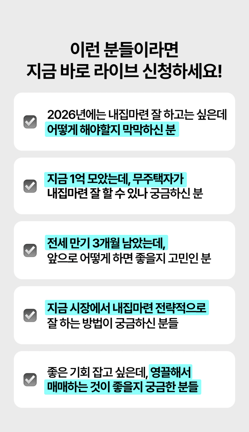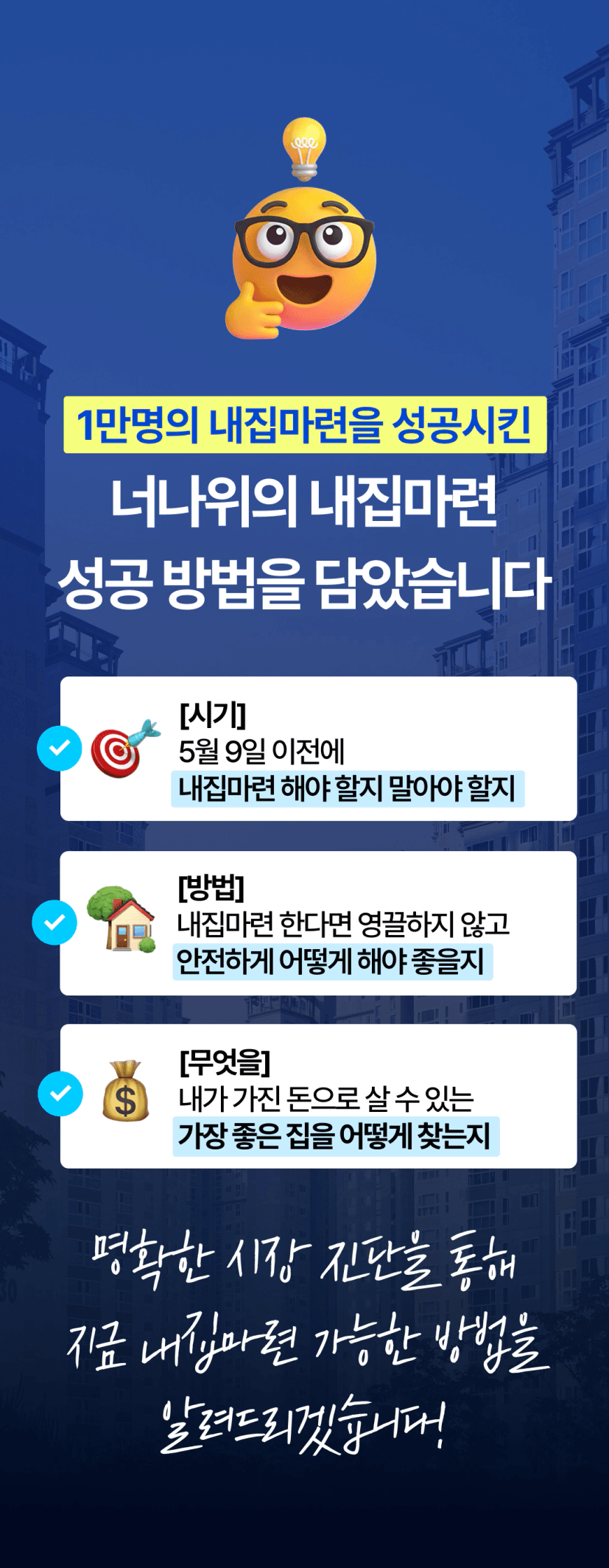 그래서 저는 5년, 10년 후에도 ‘자산 가치도 있으면서 살기 좋은 내 집’을 갖는 전략을 알려드리는 것을 목표로 합니다.