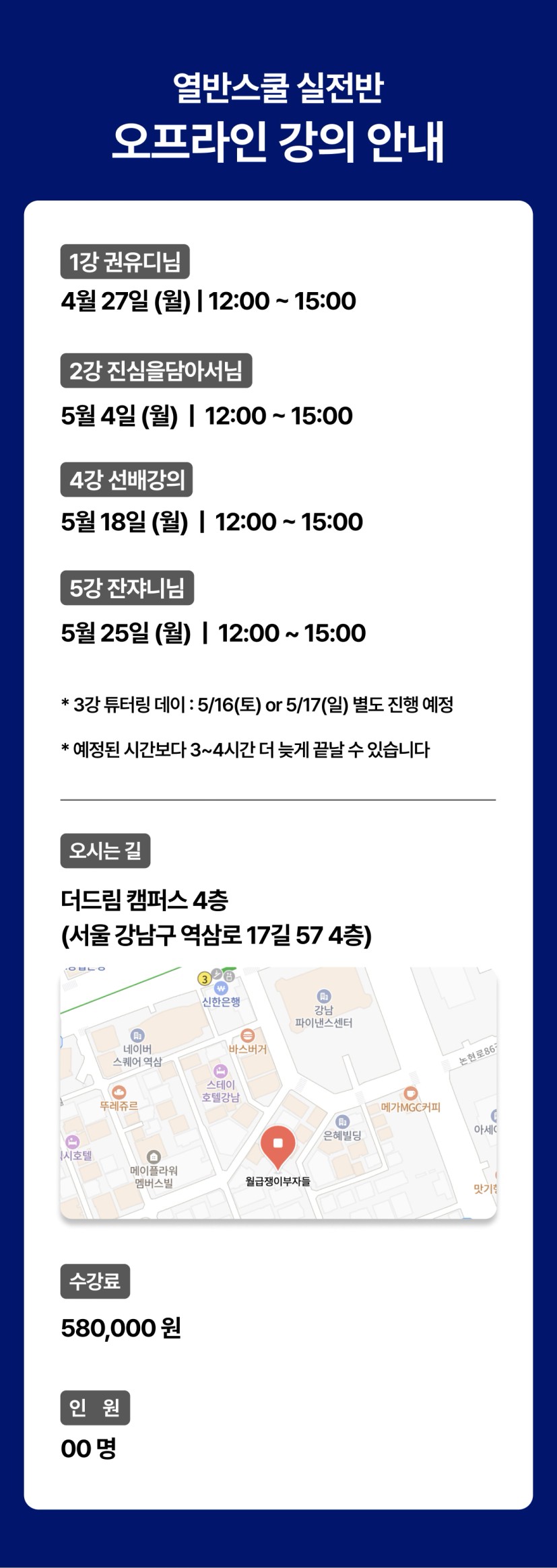 디테일의 끝판왕이라고 할까요? 조원분 한 분 한 분 세세하게 알려주시는 모습에 정말 놀랐습니다. 여러 일정 때문에 바쁘신 걸로 아는데, 이렇게까지 열심히 하실 수 있구나 느낀 튜터링이어서 더더욱 감동이었습니다.