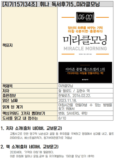 [지기15기34조 휘나] 독서후기6_미라클모닝