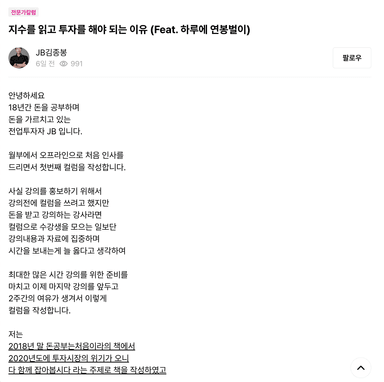 이 글 읽어보셨어요? - 지수를 읽고 투자를 해야 되는 이유 (Feat. 하루에 연봉벌이)