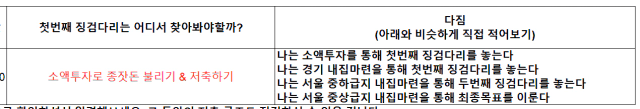 과제 제목 양식 ✍🏻 [닉네임] 나의 첫 번째 내집마련 보고서 1주차 ('손' PART) 1️⃣ 열심히 정리한 내집마련 보고서 1주차 파트 (엑셀 & PPT 양식에 맞추어) 화면 캡쳐 이미지 첨부 ★내집마련 목표: 2~3억대 집 값 목표!!!★ 2️⃣ 스스로 작성해보면서 느낀점을 한 줄이라도 적어봅시다 :) 먼저 판독기를 통해 나의 소득, 저축, 종잣돈을