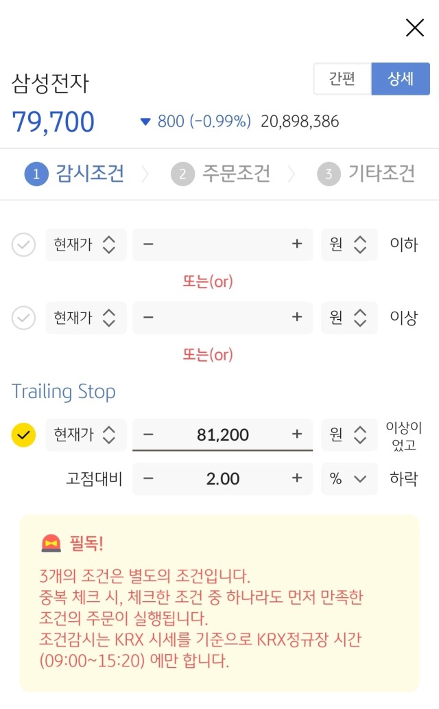 재테크기초반을 듣고 자산셋팅을 다시하면서 국장이 저평가인것 같아 삼성전자를 모았습니다. 직장인이라 주식창을 계속 들여다볼수 없어 개별주의 경우 자동매수 매도방법들을 연구해야겠다 싶어 이런저런 시도중입니다. 그래서 이번에 KB증권 자동주문으로 삼성전자 트레이딩스탑 매도주문을 시도했습니다. 상승세구간이라 생각했기에 아래사진과 같이 기준을 설정당시금액인 81,2