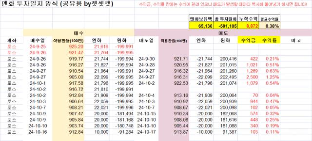 공유해주신 투자일지 엑셀파일에 정리해 봤습니다. 간단한거 같은데 눈과 머리속에 정리가 바로 되는게 아니라 엑셀에 정리해 보고 익숙해지면 시간 얼마 안들이고 간단하게 할수 있을 것같습니다. 토스엔화에 익숙해지면 달러 환율을 보고 하나증권어플로 달러투자도 진행해봐야겠습니다.