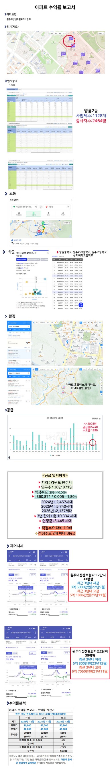 강원도 원주시 명륜2동 더샵센트럴파크2단지 아파트 수익률 분석 보고서 [열반스쿨 기초반 69기 2조 으느니]
